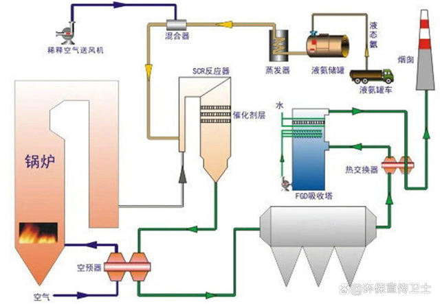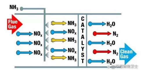 在整个工艺的设计中,通常是先使氨蒸发,然后和稀释空气或烟气混合,最后通过分配格栅喷入 SCR 反应器上游的烟气中。典型的 SCR 反应原理示意图如下: