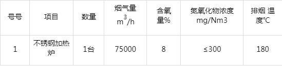 现有1台不锈钢加热炉,烟气量为75000m3/h,烟气温度180℃,运行时测得烟气中的氮氧化物排放量可达到300mg/Nm3,随着环保形势日趋严峻,现在环保部门要求达到排放标准,需要对锅炉烟气进行脱硝处理,新增加一套炉外SCR脱硝系统,安装在除尘器后面,脱完硝后的烟气通过烟囱排入大气。满足环保要求,达标排放。