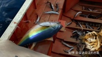 第二段暗示,是在Pi驯服老虎的过程中,有一次,海面上出现了飞鱼群,还有一只追赶飞鱼的金枪鱼也撞到了船舱里,Pi霸气的吓退老虎,自己独享了那条金枪鱼。