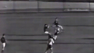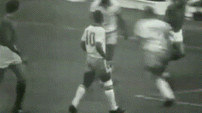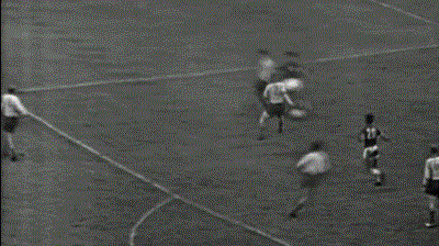 然后,我们就看到了彩虹过人这一招,贝利轻巧的把球挑过对手的头顶,像一道彩虹,然后停球抽射,破门得分。