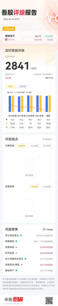 而在市场最牛逼哄哄的市值风云“吾股”评级中,奥联电子的最新排名是2841名,资产质量基本处于市场中等偏下的位置,只要是对资产质量有一定要求的投资者都不会考虑这种股票,自然也能避免这些雷。