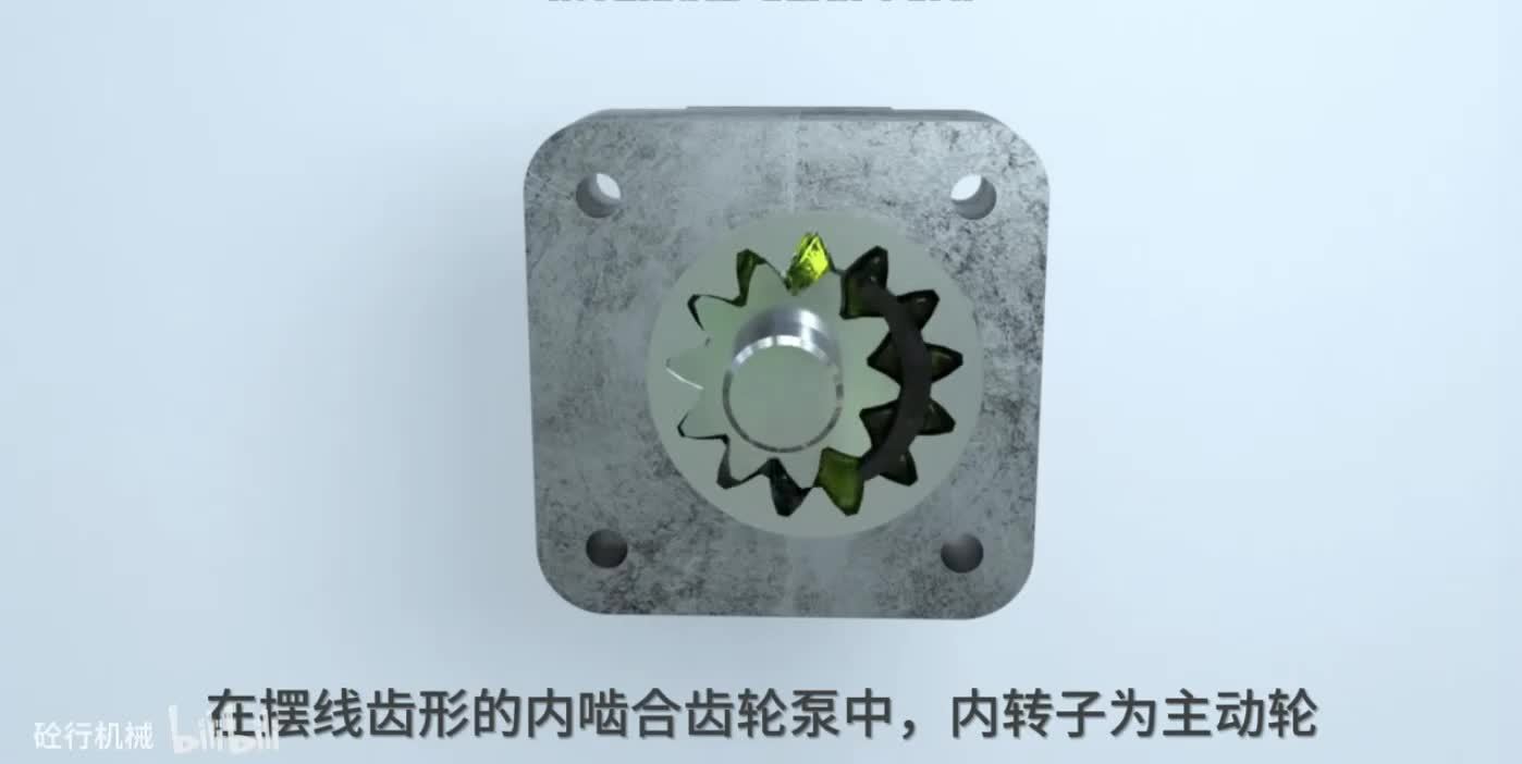 (1)工作原理:相互啮合的内转子和外转子之间有月牙形隔板,月牙板作为配油机构将吸油腔和排油腔分隔开,内外转子同方向转动形成密闭变化的工作容腔;