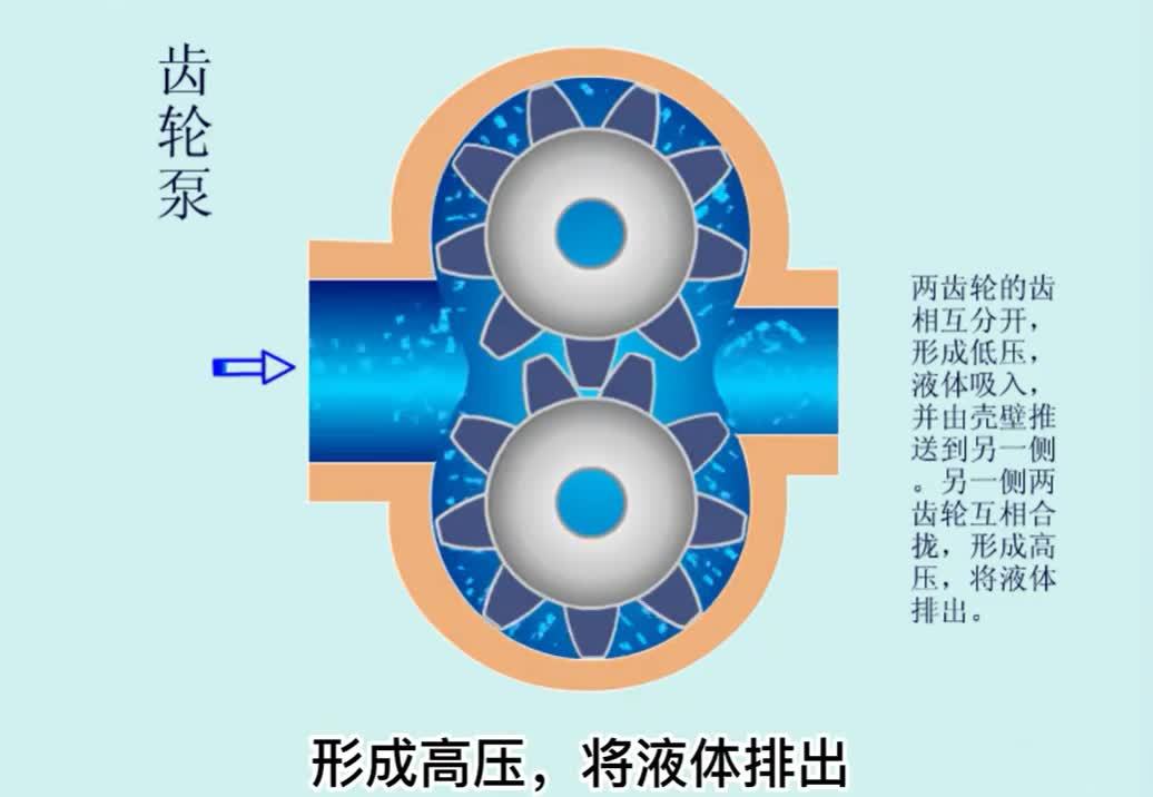 (1)装在泵体中的一对参数相同的渐开线齿轮互相啮合,齿轮与前后端盖及泵体之间行程密封工作腔,齿轮啮合线分隔吸、排油腔,起到配油作用;
