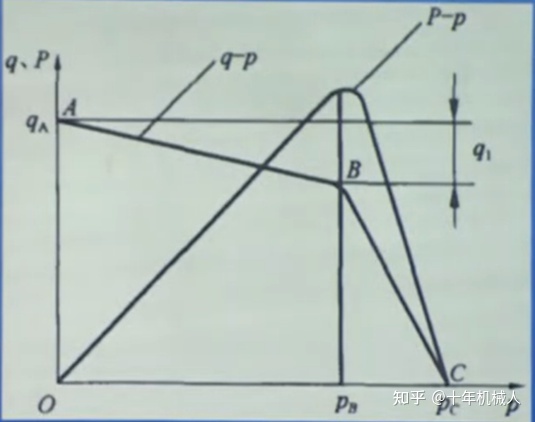 P-工作压力 qA-理论输出流量 q1-泄漏流量 q-实际输出流量 PB-限定压力 Pc-系统最大压力