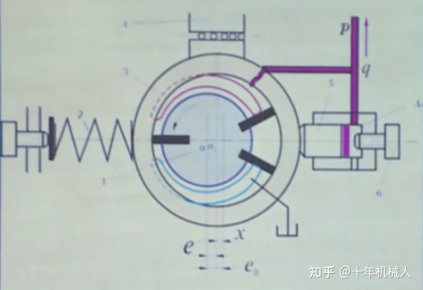 ▶泵工作时排油腔的压力作用于定子的力也有一个偏角θ,这样会对定子产生水平分力从而通过克服弹簧作用力使定子与转子的偏心距变化调节泵的输出流量;