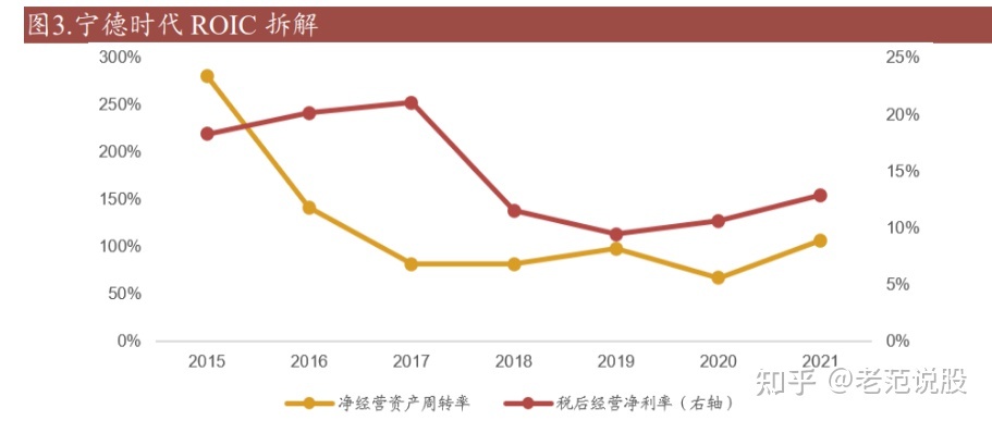 对宁德时代的 ROIC 进行拆解:ROIC=NOPAT/IC=息前税后经营利润/收入*收入/投入资本=税后经营净利率*净经营资产周转率。
