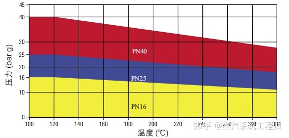 大多数设备有基于材料公称压力(PN)等级的特定最高压力和温度的限制。PN公称压力等级通常指材料在120℃度温度下能承受的最高压力。例如,PN16压力等级,是指材料在120℃时能承受的最高压力为16 bar g。在更高的温度下,最高压力会下降,但是它们之间的关系是变化的,具体情况要取决于材料本身。