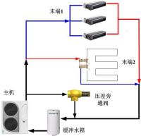 舒适家科普先生:深度二联供思考8:主机水流量数据,靶式水流开关引发的思考所以都在一次系统里面引入压差旁通阀,以便让只有一台内机运行的时候,有足够的水从这个机械件旁通回流回主机,保证回到主机有足够的流量。