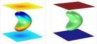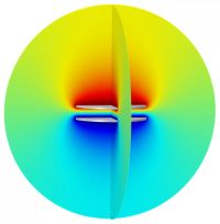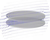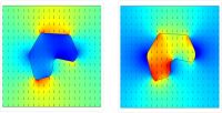介电常数大于周围环境的物体附近的电场。这两幅图显示位于两块电容板(未显示)之间,被空气( )包围的电介质体(