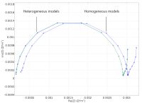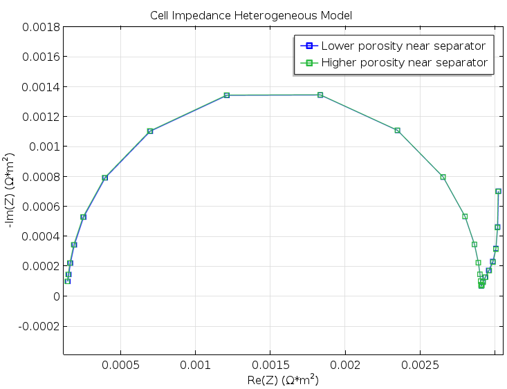 实验结果喜忧参半。令人失望的是,如图 5 所示,通过对两个几何结构进行模拟,我们得到的奈奎斯特图并没有显示图 3 和图 4 中的细微变化;令人惊喜的是,在没有任何参数拟合的情况下,Newman 模型与非均相模型表现出良好的一致性,具体请参照下图。这实在有点令人惊讶,因为我们的理想化结构在细节之处似乎过于粗糙,无法有效地进行均相化。举例来说,粒子尺寸比所模拟电池单元的宽度仅仅小一个数量级。