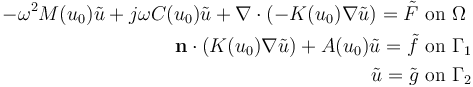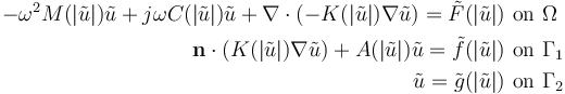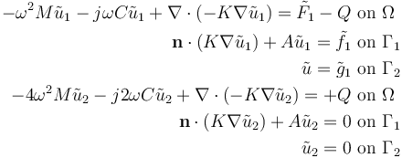 其中,在两组方程之间有一个一般域的耦合项 Q。为了简单起见,省略了静态成分。同时请记住,所有的材料属性都可以依赖于频率,因此对于不同的谐波也会有所不同。现在,我们所具有的是一组带有非线性耦合项的控制偏微分方程。求解这些方程只需要寻找我们在求解器系列文章中介绍的同样的求解方法。