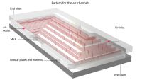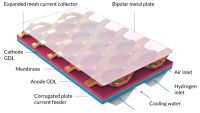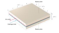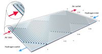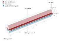图1一个电池堆中的固体氧化物燃料电池几何结构,包括双极板(上)。模型几何结构是一个包括一个空气流道和一个氢气流道(下)的基本单元。假设双极板处于恒定电势,并且不包括在模型中。电势被设置为多孔气体扩散电极(GDE)和双极板之间接触表面的边界条件。该模型包括以下方面的完整耦合: