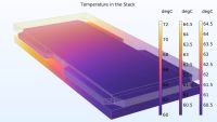 COMSOL Multiphysics 6.1 版本中引入的燃料电池堆冷却教程模型,可用于评估由 5 个电池、5 个膜电极组件和 2 个端板组成的质子交换膜燃料电池堆的热管理。这种类型的分析很重要,因为燃料电池堆电池内的温度分布不均匀会导致水蒸气冷凝不均匀,以及电池间性能的不必要变化。在本例中,电堆与携带液体冷却液的双极板交叠在一起。左图显示了用于帮助形成模型几何结构的重复单元。相比之下,中间和右侧的图片显示了最终的模型几何结构,它是由两个金属端块夹着 5 个堆叠的单元构成的。