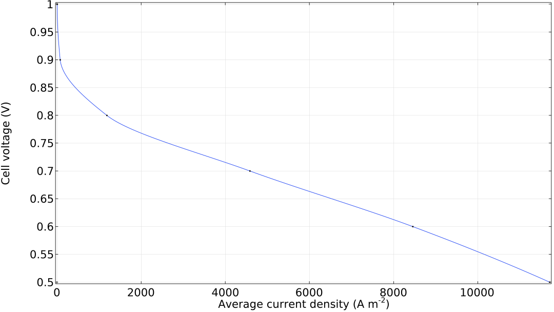 最后,我们可以为电池生成极化曲线,显示电池电压与平均电流密度(每单位膜面积的电流)的函数关系。在低电流密度下电池电压的显著下降是由于活化过电位,主要是在阴极。同时,在稍高的电流密度下,一个以欧姆损耗为主的线性区域随之出现。我们看到在高电流密度下的损耗略有增加,由于质量运输阻力,曲线略微向下弯曲。