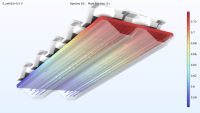 加湿空气和氢气流的入口以及液体冷却液可以在图的右侧看到。使用单相流 接口的层流纳维-斯托克斯方程描述冷却液态水,使用传热 接口定义和求解电池温度。了解电池整个工作中(包括流动、化学物质传递、电化学反应和通过电池的传热)涉及各种多物理场现象,这些现象使用模型中的以下多物理场节点进行定义:反应流、电化学加热 和非等温流。这里要研究的是空气流道中使用的膨胀网状结构的影响。该结构的目的是创建一个垂直于膜电极组件的流场分量,允许氧气供应和水排出。燃料电池的性能可能会随着控制扩展网格几何形状的参数而异。这些参数可能会影响集流体与电极接触与可用于质量传输(包括除水)的区域之间的关系。该模型允许在给定的运行条件和负载下优化结构。请查看下面这个模型结果视图,通过 COMSOL 案例库下载 PDF 文档和 MPH 文件来了解如何自己构建这个模型。