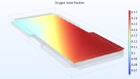 使用这个模型,我们还可以观察阴极气体混合物中的氧摩尔分数和水蒸气摩尔分数。氧气水平向出口降低,而水含量增加。