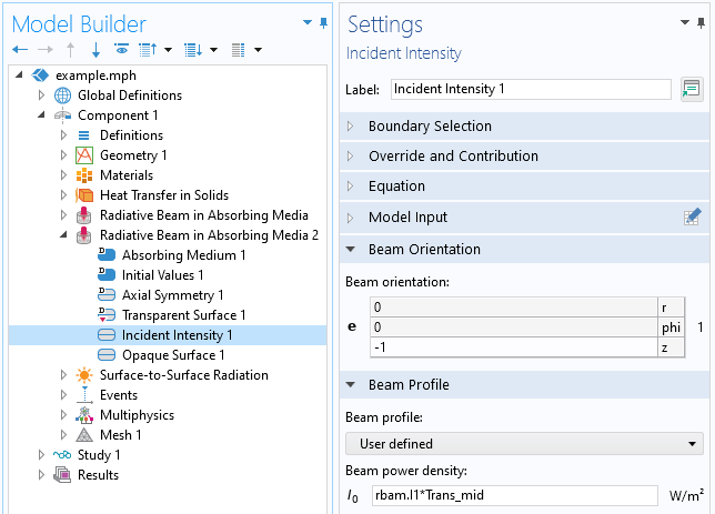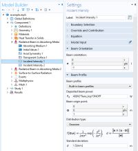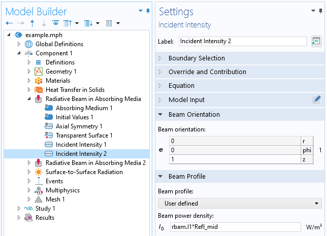 是自由空间激光波长。吸收系数可能与温度有关,但我们将从它是一个常数开始。给定光束轮廓在顶面上的强度分布,剩下整个域的光束强度通过计算获得。在沉积材料的顶层和底层之间的介电界面,将再次存在菲涅耳方程描述的反射和透射。光束的反射分量使用已有的 吸收介质中的辐射光束 接口进行处理,只需添加第二个入射强度 功能就可以了。可以向这个界面添加任意数量的入射强度 功能;每个都将引入一个额外的变量来求解,这些变量将被命名 rbam.I1, rbam.I2, …, 依此类推。在第二个入射强度 功能中,我们可以引入基于第一个光束强度和菲涅耳反射系数的用户定义的光束轮廓。通过改变光束方向的符号,可以完全考虑光在此接口上的部分反射,如下面的屏幕截图所示。从理论上讲,在顶部边界会有一个额外的光束反射,但是这个二次反射足够小,所以我们将忽略它。