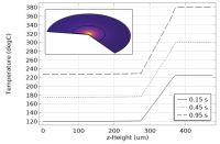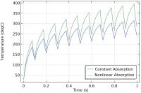 最后,为了说明,我们将介绍一种非线性材料,使底层的吸收系数随着温度的升高而上升。两种半透明材料的吸收系数比较如下图所示。随着非线性吸收系数的升高,材料的加热更大。由于这种材料的非线性,我们还需要细化具有非线性属性的层中的网格。