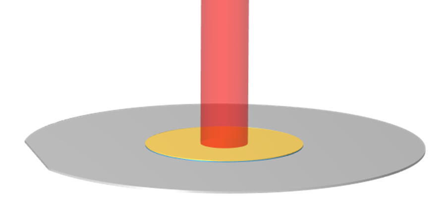 我们将以一个直径为 5cm 的硅晶圆为例,如下图所示,该晶圆的中心有两种不同的材料,每种材料厚度为 100μm,半径为 1cm。晶圆从顶部被一束高斯轮廓激光热源照射,该热源在时间上被快速脉冲化。这两种材料在 700nm 的激光波长下都是半透明的,但在更长波长的红外辐射下是不透明的。硅衬底是掺杂的并且在所有波长下都是高吸收性的。