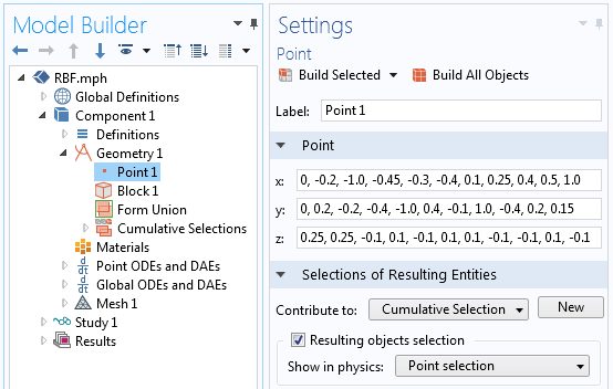 模型中的几何图形由两个特征组成。首先,点 功能用于定义点集(可以从文本文件复制坐标列表)。累积选择 用于定义所有这些点的命名选择,如下面的屏幕截图所示。此外,还有一个块 功能,它的尺寸略大于数据点的范围,并被定位为包围所有数据点。