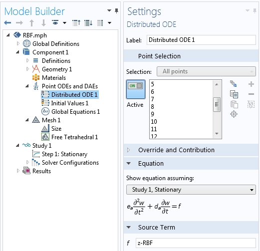 在这个物理场接口中,只需要修改两个功能。首先,需要调整分布式常微分方程 的设置,如下图所示。源项 定义为 z-RBF。由于求解稳态研究时方程中的所有其他项均为零,因此该项表示在所有选定点处 RBF=z。使用这个功能,我们可以定义等式(4) 的第 1 行到第 N 行。