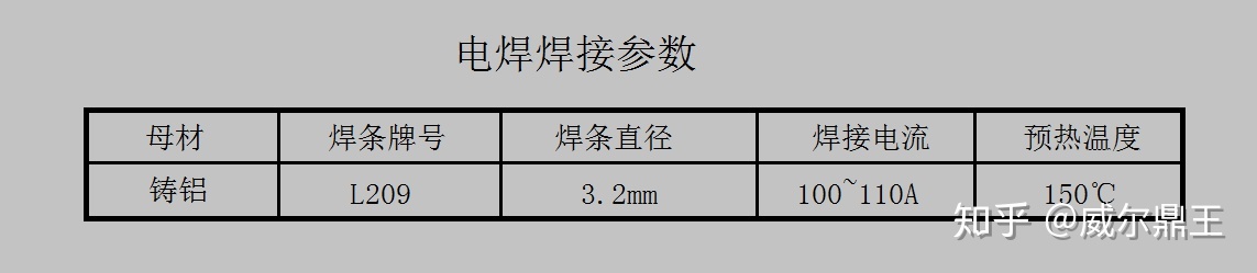 ④采用直流反接电源,Φ3. 2mm、铝209电焊条,焊接电流 100~110A,中长电弧进行焊接。参数见图1