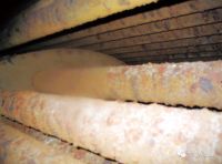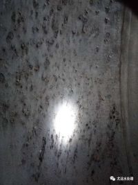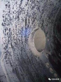 下图为热水炉锅内烟管、锅筒、炉胆上的大量贝壳状鼓包,直径在10~30mm之间,鼓包外层为坚硬且附着性很强的黄褐色沉积物,刮开外层,中间为铁锈,最下层为黑色物质。