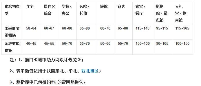 我们先了解一个知识,采暖热指标也就是单位面积热负荷,它根据建筑采暖热指标与室外温度、建筑维护结构、保温材料的传热系数、窗体的传热系数、建筑物体形系数、新风量大小、热损失等都有关系,致使同类建筑的热指标有所差异,各地的热指标更有所差异。下面是文件给出的热指标推荐值(单位W/㎡)
