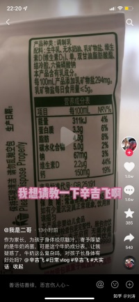 这个视频的作者买牛奶给孩子喝。看了辛吉飞的视频后,怀疑配料表里生牛乳后边的食品添加剂都是有害的,上抖音求助。点开评论,99%的人都在说“这不是牛奶”、“调制乳就是饮料”、“不能喝”、“纯纯的科技与狠活儿”、“资本害人”等等。