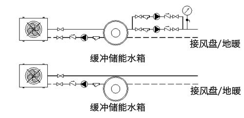 为避免压缩机频繁启动、增加系统的热稳定性,应校核系统水容量是否能满足系统热稳定性的要求。即当系统中(水)所存储的能量不足以维持短暂停机(比如化霜)时水温波动要求(夏季不大于5℃,冬季不大于3℃),应设置缓冲水箱。