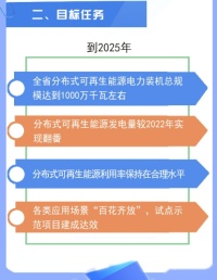 近日,山西省人民政府办公厅印发了《山西省推进分布式可再生能源发展三年行动计划(2023-2025年)》。其中确定目标任务:到2025年,全省分布式可再生能源电力装机总规模达到1000万千瓦左右;分布式可再生能源发电量较2022年实现翻番;分布式可再生能源利用率保持在合理水平;各类应用场景“百花齐放”试点示范项目建成达效。