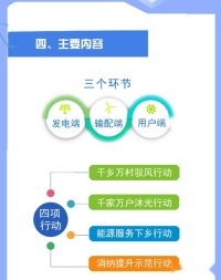 主要内容实施方面包括三个环节、四项行动、十个计划。其中三个环节为发电端、输配端、用户端;四项行动包括千乡万村驭风行动、千家万户沐光行动、能源服务下乡行动、消纳提升示范行动。十个计划主要落在乡村振兴、交通廊道、建筑屋项、整县试点、风电下乡入景、风电技改扩容、农网巩固提升、乡镇能源服务、多元直接利用、绿色低碳示范。