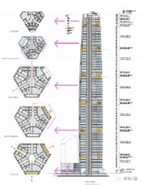- 随着电梯分区的变化而变化。基于电梯分区的缘故,超高层建筑的电梯井道越往上就越少,核心筒截面自然产生变化。