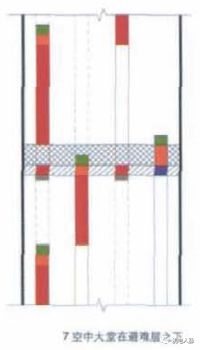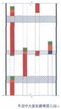 - 在这种情况下由于上一段电梯不需要避让下一段电梯突出的机房,在电梯布置上拥有更大的灵活性,可见这种空中大堂的位置是最为理想的。