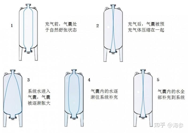 从上图可以看出,当具备压力的水冲入稳压罐的时候,胶囊是逐渐被压缩的,胶囊被压缩的空间就是储水的容积,当胶囊不能被再压缩的时水泵自动停机,如果有小流量用水的情况下,气压罐就可以实现出水的过程,只有待胶囊完全膨胀回来后管道压力才会有明显变化,这就是稳压罐的稳压过程,整个过程就是借助水不可压缩和气体可压缩这个特征来实现的。