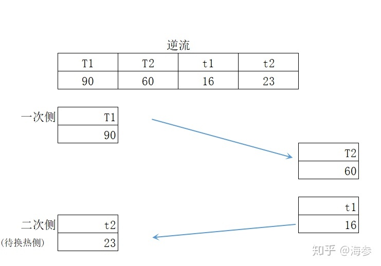 下面解释一下,什么叫做逆流,逆流的意思就是一次侧和二次侧的水流方向相反,那么他们的传热即如下所示: