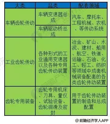 按照产品用途,齿轮行业可以细分为三类:车辆齿轮、工业齿轮及齿轮专用装备;车辆齿轮产品应用的领域包括各类汽车、摩托车、工程机械、农机和军用车辆等;工业齿轮产品应用的领域包括船用、矿山、冶金、航空、电力等;齿轮专用装备主要为齿轮专用机床、刀具等齿轮制造配套设备。