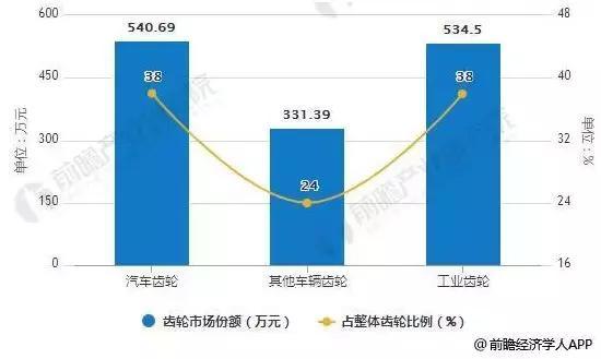 在我国庞大的齿轮市场中,车辆齿轮的市场份额达到 62%,工业齿轮占 38%,其中,汽车齿轮又占车辆齿轮的 62%,即占整体齿轮市场的 38%,其他车辆齿轮占整体齿轮市场的 24%。