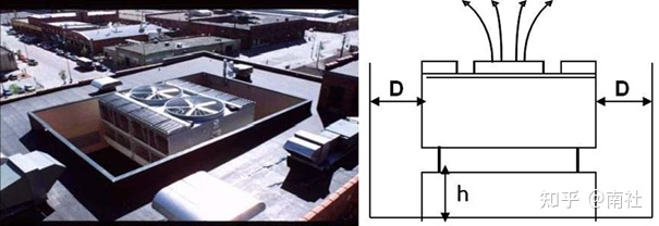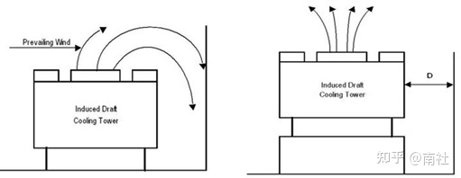 避免热风回流,冷却塔出口要等于或高于临近建筑物,墙壁等,布置方向上应考虑季风影响。