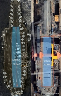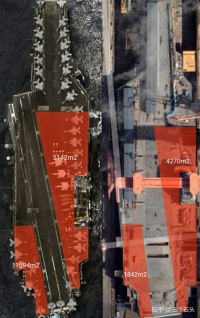 弹射器和弹药机是协同设计,弹射器越长,弹药机就越靠后,弹药机是从船底弹药库直通甲板的垂直弹药机。这无异于限制了机库的长度。小鹰级前弹药机是非常靠前。加上机库侧壁003更厚,机库面积进一步缩小。