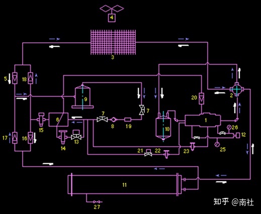 1.压缩机;2.四通阀;3.翅片换热器;4.风机;5.16.17.18.20.单向阀; 6.经济器;7.截止阀;8.视液镜;9.贮液器;10.汽液分离器;11.壳管换热器 12.压力控制器;13.21.电磁阀;14.22.23.热力膨胀阀;15.电子膨胀阀;19.干燥过滤器;25.26.压力表。