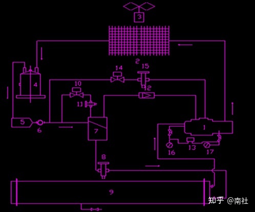 制冷部件:1、压缩机;2、翅片换热器;3、风机;4、高压罐;5、干燥器 6、视液镜;7、经济器;8、电子膨胀阀;9、壳管换热器;10、14、电磁阀; 11、15、热力膨胀阀;12、单向阀;13、压力控制器;16、17、压力表。
