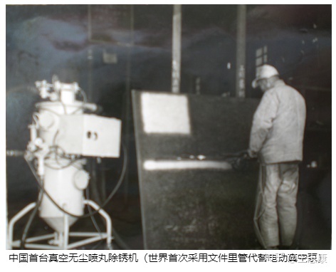 从美国杂志上学习到他们利用“大功率真空抽吸粉体和颗粒的原理”,发明了采用电动真空泵制造真空,实现钢丸喷射物件表面,进行物件表面除锈加工。