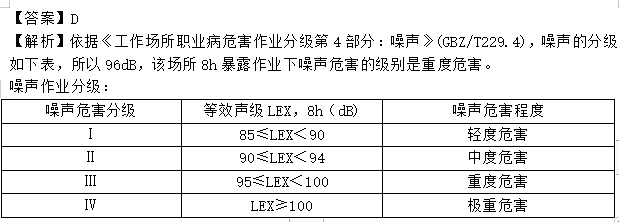 1.某食品加工企业引进两套制冷设备安装测试后,经检测两套设备正常运行时的噪声值为96dB。为保证制冷工的身心健康,该企业安全部在现场设置了职业危害告知卡,配备相应防护器材。根据《工作场所职业病危害作业分级第4部分:噪声》(GBZ/T 229.4),该场所8h暴露作业下噪声危害的级别是( )。