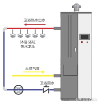 (1)工作原理:内置大容量储水箱,设备循环加热储水箱里的生活用水,当水箱温度探头探测到的温度比设置温度低于5℃时启动燃烧加热水箱,水箱温度高于设置温度5℃时,停止加热,熄火待机。