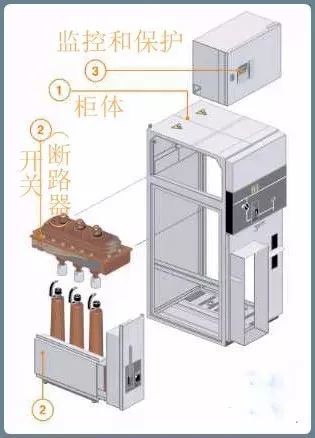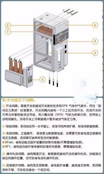 环网柜由一般由开关室、熔断器室、操动机构室和电缆室(底架)四部分组成。
