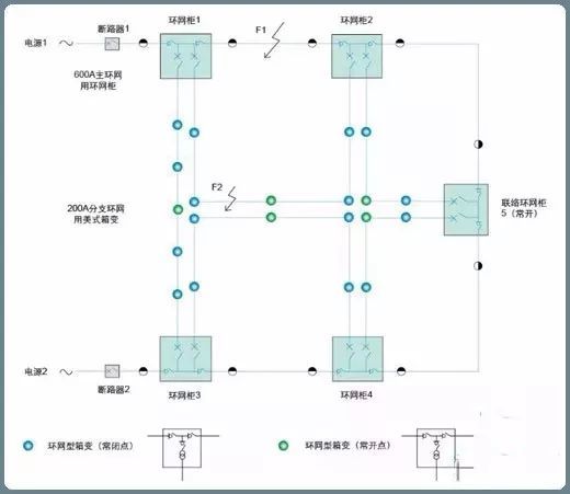 环网是指环形配电网,即供电干线形成一个闭合的环形,供电电源向这个环形干线供电,从干线上再一路一路地通过高压开关向外配电。这样的好处是,每一个配电支路既可以从它的左侧干线取电源,又可以从它右侧干线取电源。当左侧干线出了故障,它就从右侧干线继续得到供电,而当右侧干线出了故障,它就从左侧干线继续得到供电,这样一来,尽管总电源是单路供电的,但从每一个配电支路来说却得到类似于双路供电的实惠,从而提高了供电的可靠性。