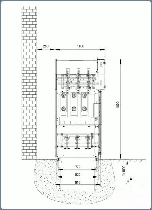 安装时按环网柜先后顺序排列在地基的槽钢上,将柜体靠紧,并用螺栓固定旋紧,柜面应排列整齐,柜顶与屋顶的距离应大于600mm。