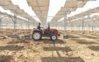 亿利集团光伏板下施工人员正在机械化种植甘草。