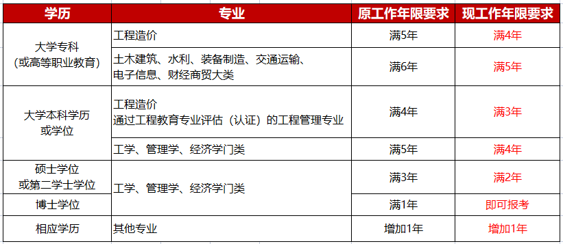 2022年3月11日,人力资源和社会保障部发布《关于降低或取消部分准入类职业资格考试工作年限要求有关事项的通知》,政策终于落地,2022年起一级造价工程师资格考试报名条件工作年限调整降低,具有相应学历,从事从事工程造价、工程管理业务工作年限的降低,也给了更多考生报考的机会!
